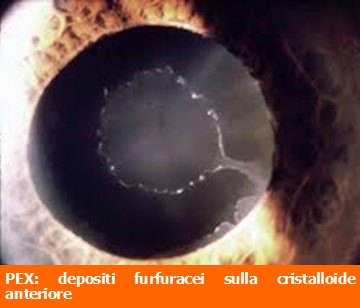 Piccole scaglie di materiale, similfurfuracee, tendono ad accumularsi sulla superficie del cristallino, dell’iride, della zonula e del corpo ciliare